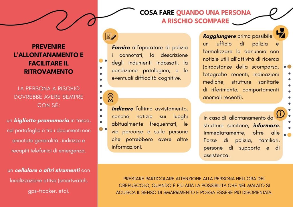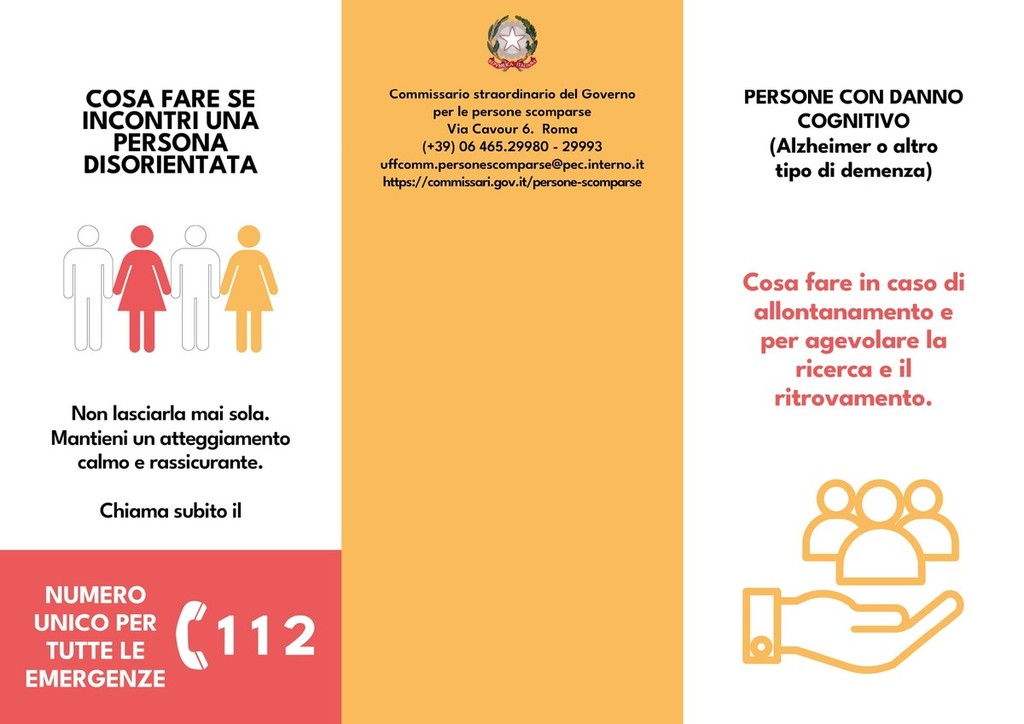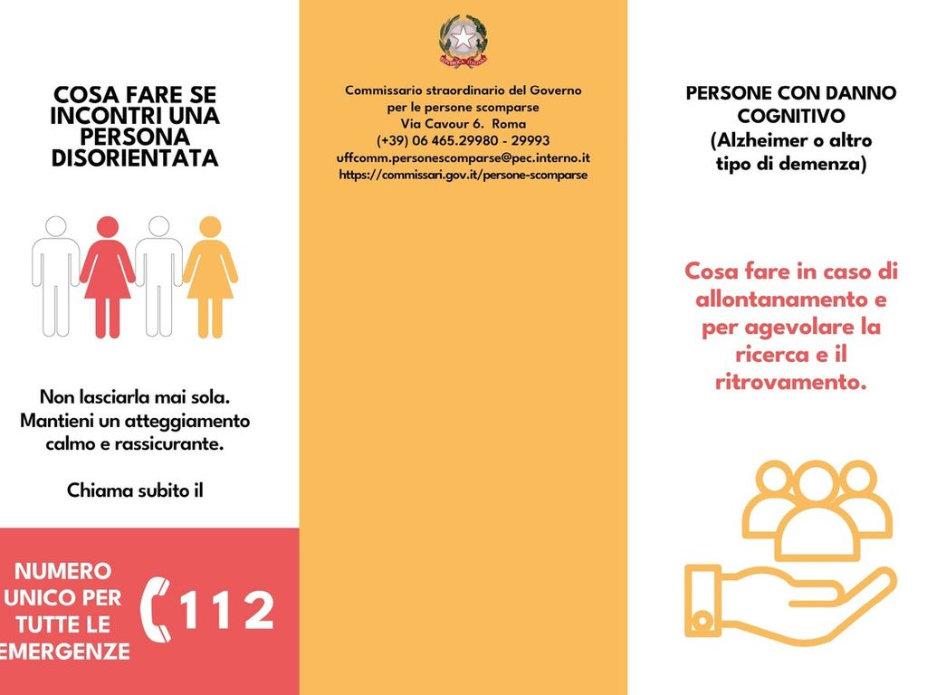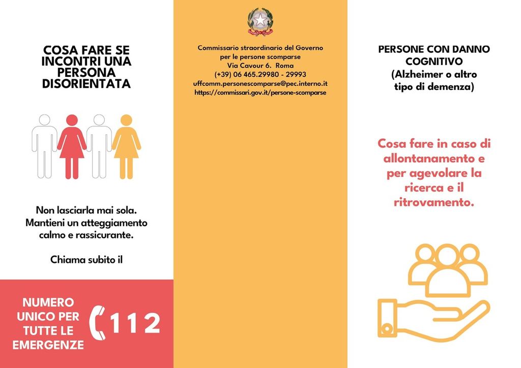 Tale brochure è rivolta sia ai familiari della persona a rischio di scomparsa, sia ai cittadini, in quanto richiama l’attenzione sul comportamenti da tenere quando si incontra una persona in evidente stato di disorientamento. Il cennato opuscolo è, altresì, scaricabile dal sito del Commissario straordinario del Governo per le persone scomparse al seguente link: https://commissari.gov.it/media/rjod1okq/brochure-persone-danno-cognitivo.pdf