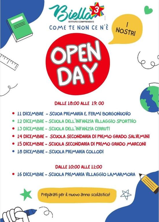 Dalle 18:00 alle 19:00 ci saranno gli Open Day l'11 dicembre alla scuola primaria E. Fermi Borgonuovo; 12 dicembre - scuola del Infanzia Villaggio Sportivo e il 13dicmbre
