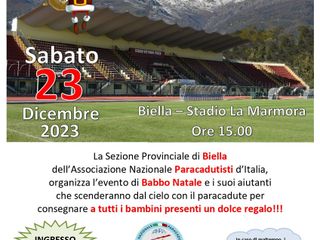 La Sezione di Biella dell’Associazione Nazionale Paracadutisti d’Italia, con il patrocinio di Provincia e Comune di Biella, organizza la quarta edizione di “Babbo Natale Paracadutista”, la manifestazione dedicata a tutti i bambini e famiglie, che si terrà a Biella