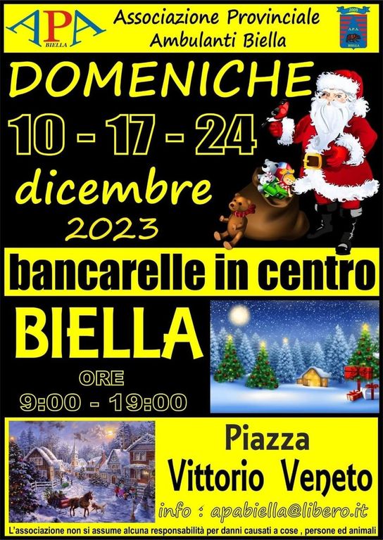L’Associazione Provinciale Ambulanti, in occasione delle feste natalizie, propone un ultimo incontro di “Bancarelle in centro”, per la Vigilia di Natale. Domenica 24 dicembre 2023, sarà possibile passare fra i banchi di Piazza Vittorio Veneto, dalle ore 9.00 alle 19.00, per effettuare gli ultimi acquisti.