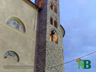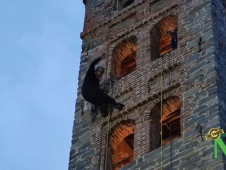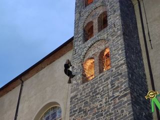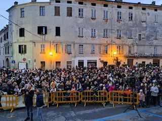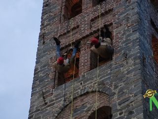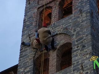 Pubblico delle grandi occasioni al rione Riva di Biella per la calata della Befana dal campanile della chiesa di San Cassiano.