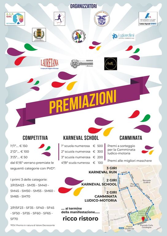 ASD GAC Pettinengo organizza, sabato 17 febbraio 2024 e con la collaborazione del Centro Commerciale “I Giardini”, una corsa podistica che si mescola al Carnevale, dando vita alla 6a Karneval Run.