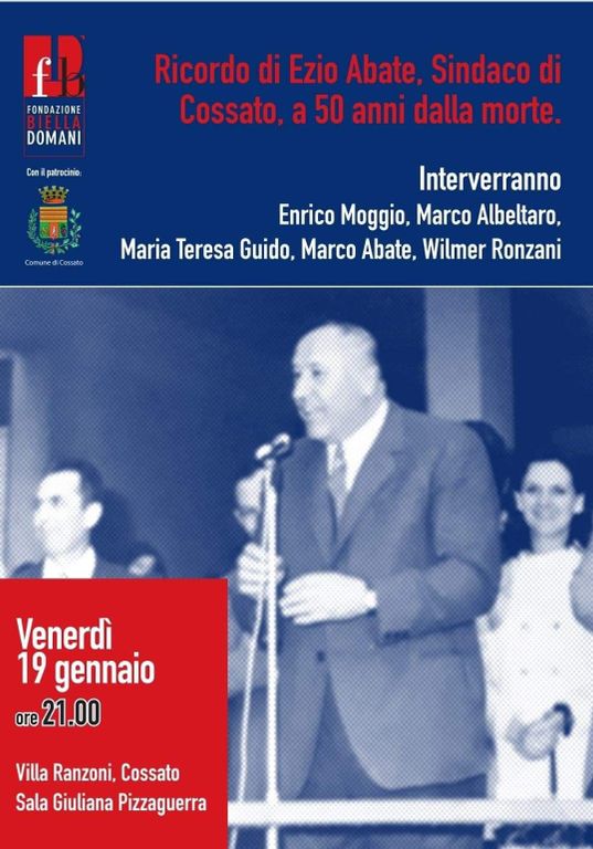A 50 anni dalla morte la comunità di Cossato si ritrova per ricordare Ezio Abate, lo storico primo cittadino della città. L'incontro avrà luogo alle 21 di venerdì 19 gennaio, nei locali di villa Ranzoni. Interverranno il sindaco Enrico Moggio, insieme a Marco Albeltaro, Maria Teresa Guido, Wilmer Ronzani e Marco Abate.
