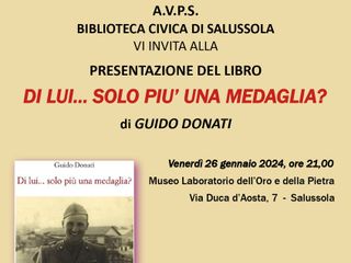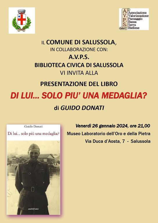 L'Assessorato alla Cultura del Comune di Salussola, in collaborazione con A.V.P.S. - Associazione Valorizzazione del Paesaggio della bassa Serra Biellese, e la Biblioteca Civica di Salussola, propone per Venerdì 26 Gennaio 2024, alle ore 21,00, una serata culturale durante la quale sarà presentato il libro "Di lui… solo più una medaglia?” di Guido Donati.