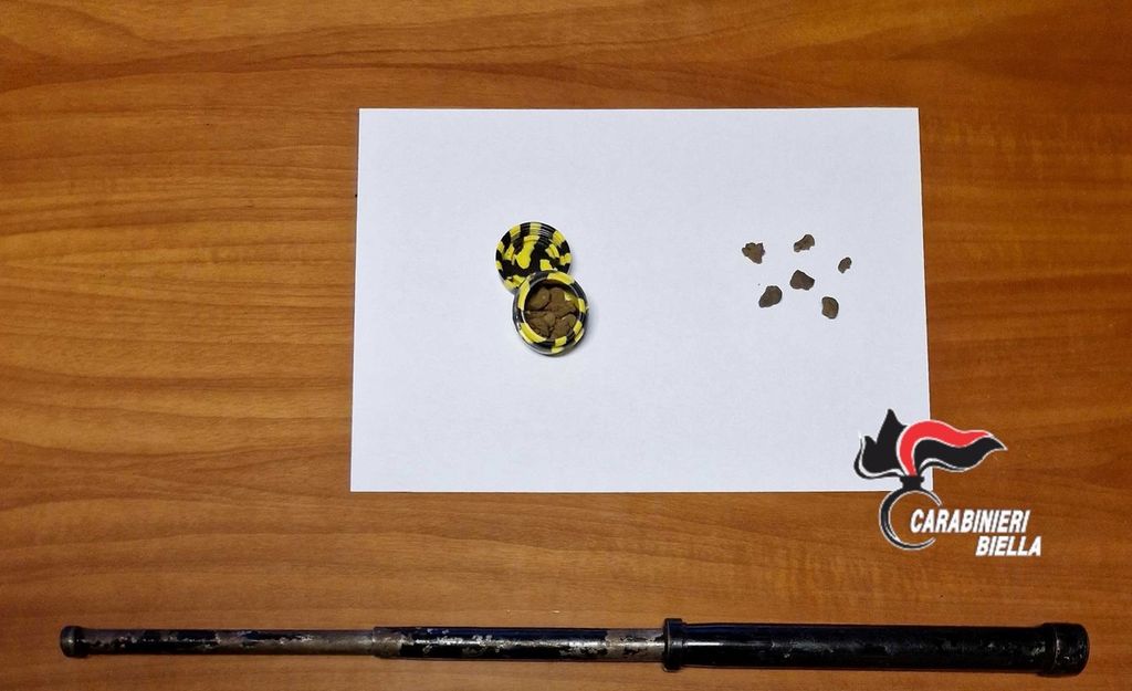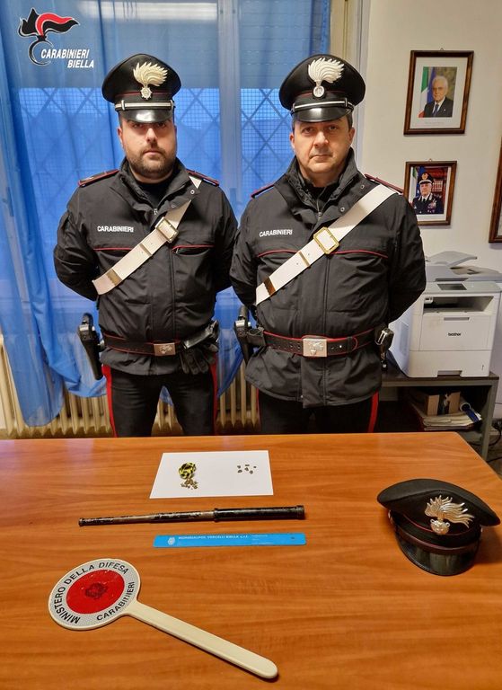Visto lo strano atteggiamento, i militari procedevano al controllo del mezzo, nonché i precedenti specifici in materia di stupefacenti, procedevano a perquisizione veicolare dell’auto. All’interno dell’abitacolo del veicolo, veniva rinvenuto un bastone rigido telescopico il cui possesso risultava ingiustificato, mentre in tasca ai ragazzi, a seguito di perquisizione personale, venivano trovati, al 25enne, grammi 0,5 circa di sostanza stupefacente del tipo “hashish” ed al 23enne di Cossato grammi 1,00 circa della medesima sostanza.