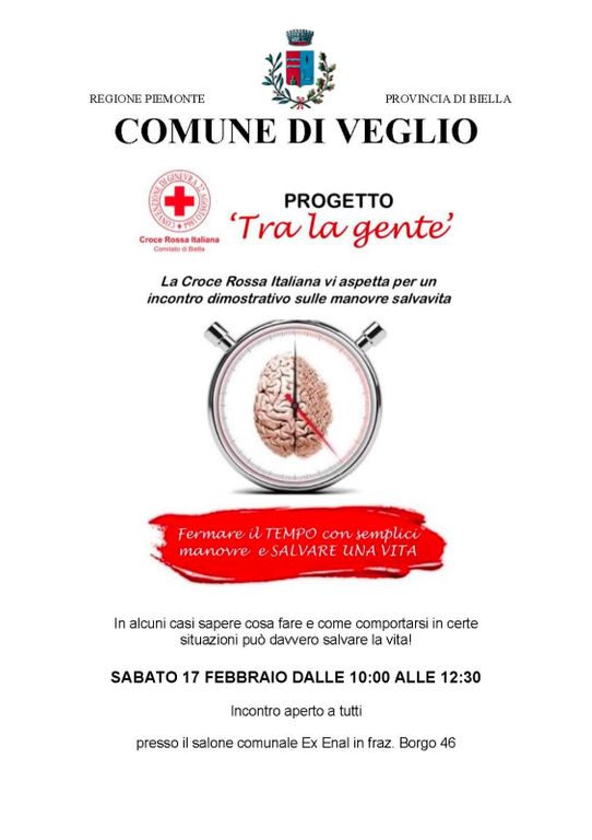 Il Comune di Veglio organizza, sabato 17 febbraio, il progetto “Tra la gente” che vedrà la partecipazione attiva della croce Rossa Italiana, per un incontro dimostrativo sulle manovre salvavita: “Ferma il tempo con semplici manovre e… Salva una Vita!”