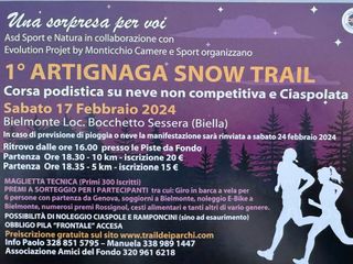 Sempre sabato 17 a Bielmonte, in località Boccchetto Sessera ci sarà l'"Artignaga Snow Trail". A organizzare l'evento è l'Asd Sport e Natura in collaborazione con Evolution Project by Monticchio Camere e Sport, un'avventurosa corsa podistica su neve non competitiva e ciaspolata alla quale si potrà partecipare scegliendo tra un percorso lungo 10 km e uno di 5 km. Preiscrizione gratuita su traildeiparchi.com. Per maggiori informazioni: Paolo 328 8515795, Manuela 338 9891447, Associazione Amici del Fondo 320 9616218. Il ritrovo è alle presso le piste da fondo, la partenza alle 18,30 per la 10KM e alle 18,35 per la 5Km.