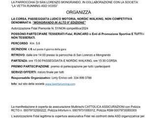 La parrocchia di San Lorenzo a Mongrando, in collaborazione con la società “La Vetta Running asd vc053” organizza per oggi, sabato 24 febbraio la corsa, passeggiata ludico motoria, nordic walking, non competitiva denominata: “Mongrando in Alto 9° edizione”. Possono partecipare tesserati Fidal, runcard o enti di promozione sportiva e tutti i non tesserati. Il percorso sarà lungo km. 5,6; iscrizioni: € 6 sul posto il giorno della gara Il ritrovo è alle ore 14:00 presso la parrocchia di San Lorenzo a Mongrando, la partenza alle 15:00 passeggiata e nordic walking, ore 15:30 corsa. Premio partecipazione: premio di partecipazione per tutti i partecipanti. Servizi offerti: ristoro finale per tutti responsabile organizzativo: Linty Enrico cell. 334 899 3788 info: sul sito della società www.lavettarunning.com