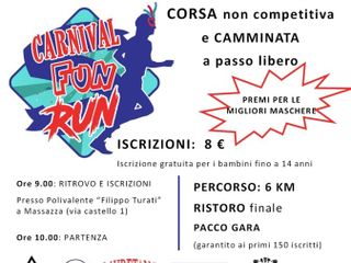 A Massazza sempre domani, domenica 25 febbraio l’associazione turistica "Proloco Massazza", organizza la “Carnival Fun Run”, con la partecipazione e l'aiuto del Comitato del Carnevale. La manifestazione è una Camminata Ludico Motoria e Corsa non competitiva aperta a tutti (tesserati FIDAL – ENTI DI PROMOZIONE e RUNCARD). Possono partecipare alla manifestazione, che è NON COMPETITIVA, tutte le persone in buono stato di salute.