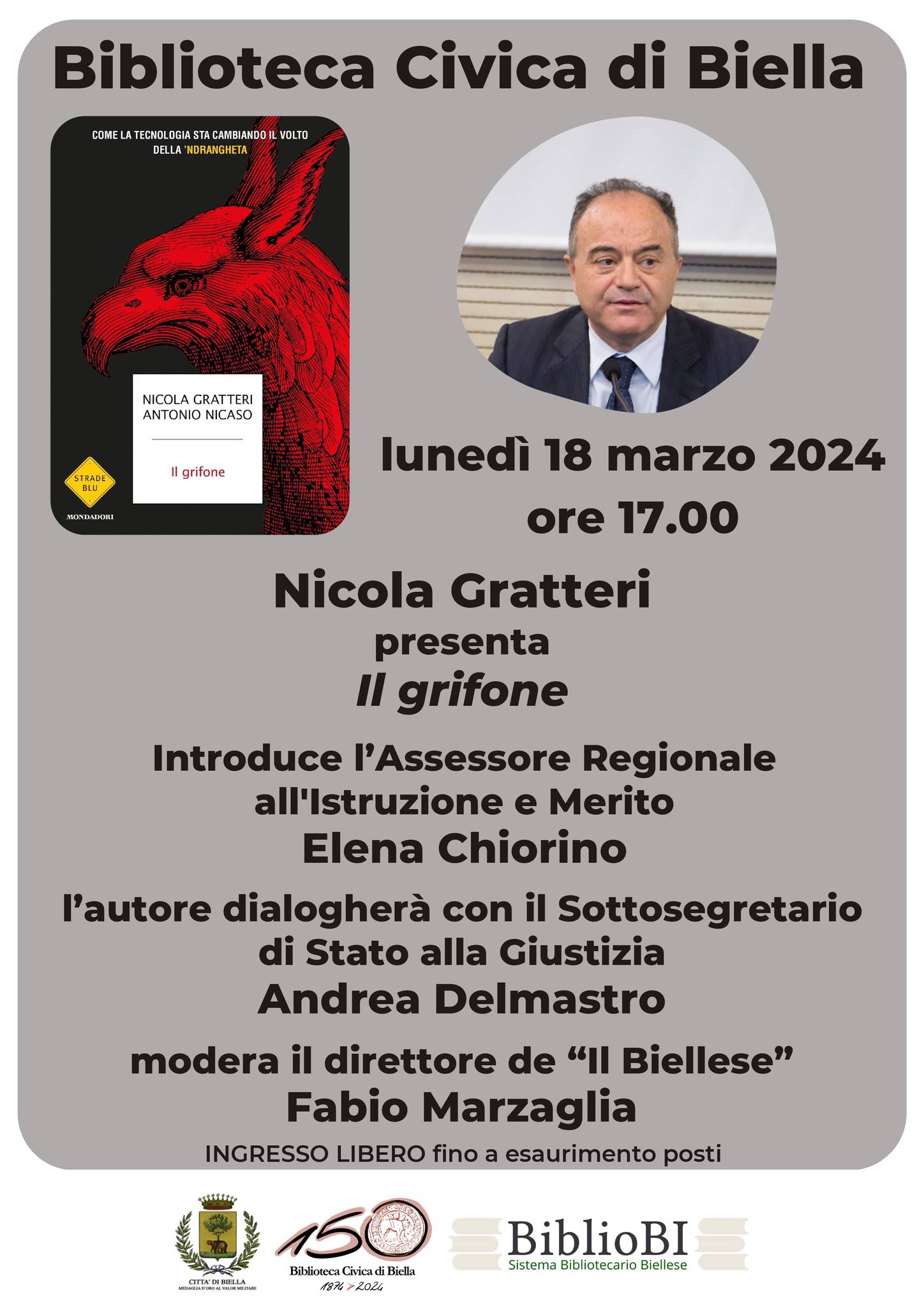 La giornata biellese di Gratteri proseguirà poi alle 17, con la presentazione dell’ultimo libro del Procuratore, “Il Grifone”, presso la Biblioteca Civica di Biella (piazza Eugenio Curiel 13).