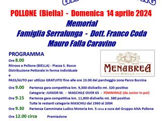 Alle ore 9.30 è invece prevista la partenza della Camminata Ludico Motoria km. 5 circa a cura del Gruppo ANA Pollone. Alle ore 12.00 circa Premiazione.