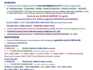 Le iscrizioni vanno fatte via mail al seguente indirizzo: teamasg74@gaglianico74.it inviando i seguenti dati: N. TESSERA FIDAL - COGNOME - NOME - ANNO di NASCITA - CODICE SOCIETA’ - SOCIETA’ i tesserati RUNCARD e EPS (Ente di Promozione Sportiva) dovranno inviare i dati sopra riportati e anche la copia della tessera e del certificato medico per l’attività agonistica per l’atletica leggera. Entro le ore 24.00 di GIOVEDI’ 11 aprile