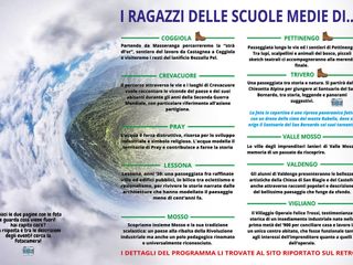 Le scuole medie nei Comuni di Coggiola, Pettinengo, Crevacuore, Lessona, Vigliano, Valdengo e Valdilana (negli ex comuni di Mosso, Trivero e Valle Mosso), hanno ideato vari percorsi che troverete meglio illustrati nella locandina dedicata.