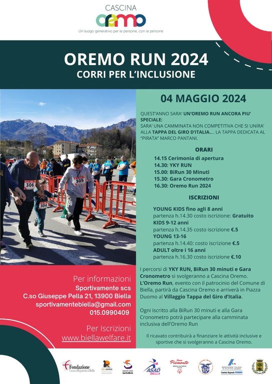 Alle 15.30 il via alla “Gara Cronometro”, della durata di 30 minuti. Alla fine del tempo verranno calcolati i giri percorsi in totale da ogni atleta. Alle 16.30 infine verrà dato il via alla camminata dell’inclusione dell’Oremo Run che quest’anno, in occasione dell’arrivo di tappa a Oropa del Giro d’Italia, partirà da Cascina Oremo e arriverà in piazza Duomo a Biella, sede del Villaggio di Tappa dedicato al “Pirata” Marco Pantani. Sarà un’occasione unica per portare alla cittadinanza biellese e alle tante persone che saranno presenti nel centro storico della città un importante messaggio di inclusione attraverso la pratica sportiva.