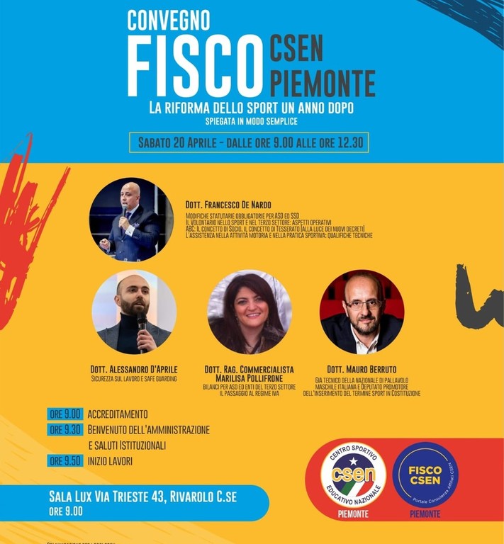 Sarà presente anche Elena Miglietti, giornalista, scrittrice e referente per Piemonte e Valle d’Aosta della Fondazione Sportcity. Interverranno anche i componenti del Comitato Nazionale FiscoCSEN Francesco De Nardo, Alessandro D’Aprile e Marilisa Pollifrone. Tra i temi che verranno affrontati ci saranno: le modifiche statuarie obbligatorie per ASD e SSD, la sicurezza sul lavoro e il save guarding, il volontariato nello sport e nel terzo settore, il concetto di socio e il concetto di tesserato, i bilanci per ASD ed enti del terzo settore e il passaggio al regime IVA. Al convegno saranno presenti circa 150 associazioni di tutto il Piemonte. Numeri importanti per una tematica molto sentita per il mondo dello sport in ogni suo aspetto e ramificazione.