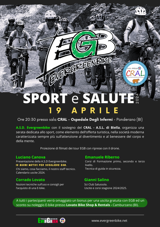 Sport e Salute è l’evento biellese dedicato alla promozione dell’attività fisica, per il benessere del corpo e della mente. Organizzato dall’ASD EverGreenBike, con il sostegno del CRAL – ASL Biella e l’affiliazione CSEN Biella, l’evento propone la proiezione di filmati tour EGB, percorsi in E-bike e consigli pratici e teorici per condurre uscite in totale sicurezza.