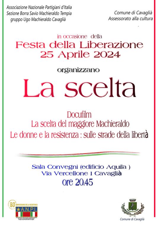 Verrà proiettato giovedì 25 aprile il docufilm “La Scelta”, in occasione della Festa della Liberazione. L’evento, organizzato dall’ANPI e il Comune di Cavaglià, avrà inizio alle ore 20.45, presso la Sala convegni del Comune, in Via Vercellone 1.