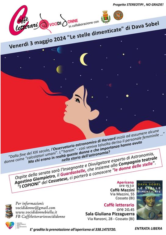 Il prossimo caffè letterario di VocidiDONNE si svolgerà venerdì 3 maggio. Dopo il classico aperitivo, ci si sposterà nella Sala Pizzaguerra di Villa Ranzoni a Cossato per confrontarsi sul libro "Le stelle dimenticate" di Dava Sobel con il Docente e Divulgatore astronomico Agostino Giampietro, il famoso Guardastelle.