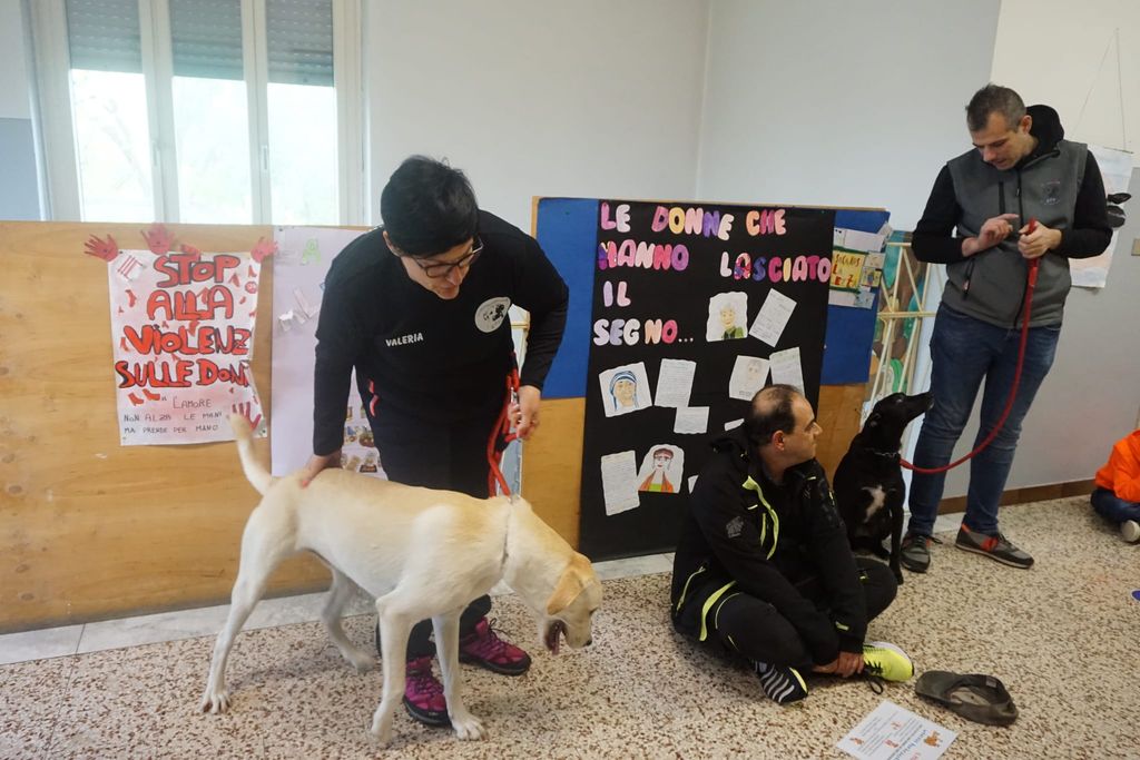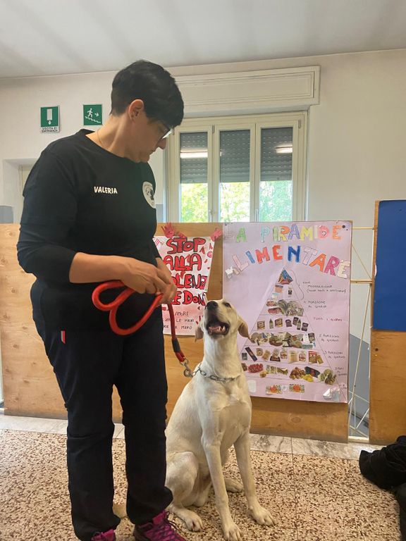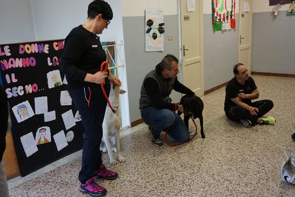 Ai bimbi delle elementari sono stati presentati Thiago e Mya da parte di Diego De Zen, referente regionale di Scodinzolando con Flo e padrone di Mya, Marco Borin de Il canile rifugio Il Pioppeto e Valeria Bonardi, collaboratrice di Diego, addestratrice, che al momento ha in stallo Thiago, che aspetta di essere adottato.