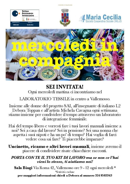 Hai del tempo libero e vorresti fare i tuoi lavori manuali con qualcuno? Sei a casa dal lavoro? Sei in pensione? Sei una nonna che aspetta i suoi nipoti e ha un po’ di tempo? A Vallemosso è nato un laboratorio per tutte le donne che hanno del tempo libero e vogliano condividere i loro lavori manuali di uncinetto, maglia, ricamo.. o che abbiano voglia di imparare a realizzarli in compagnia di altre donne, scoprendo le loro storie, i loro racconti e passare dei momenti insieme in buona armonia.