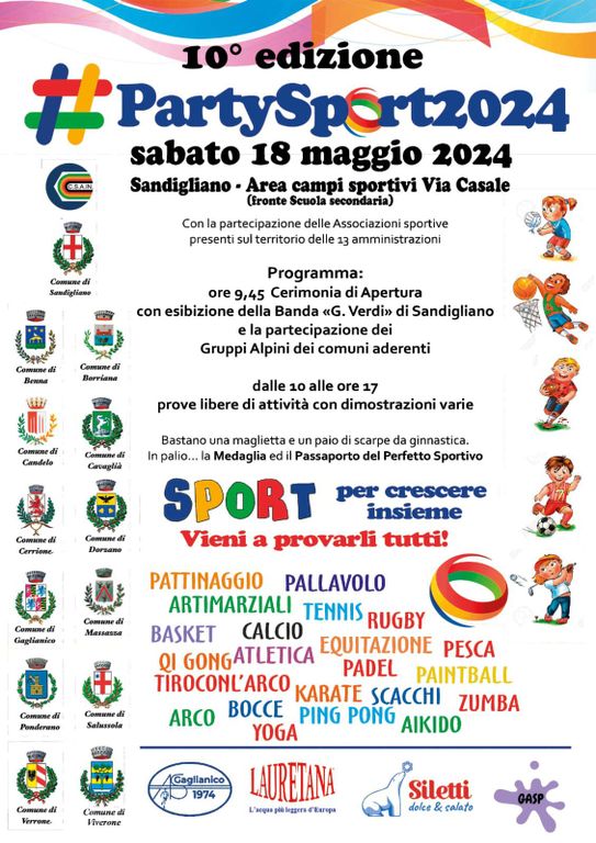 Tutto pronto a Sandigliano per una nuova edizione di “Party sport”. Dal 2012 tra maggio e l'inizio di giugno la manifestazione si svolge a turno dai Comuni che vi partecipano. E se l'anno passato aveva avuto con location Cavaglià e nel 2022 Gaglianico, quest'anno l'organizzazione spetta a Sandigliano sabato 18 maggio.