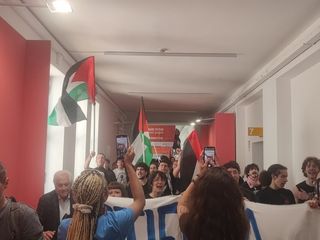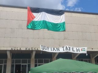 Lì un'enorme bandiera palestinese è stata calata dal tetto dell'aula magna, rinominata da uno striscione a Sufian Tayeh, scienziato e rettore dell'università di Gaza ucciso da un raid israeliano a dicembre 2023.