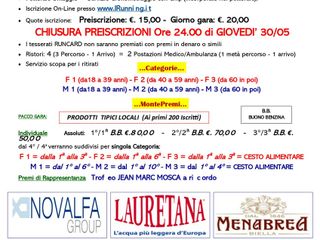 • Quote iscrizione: Preiscrizione: €. 15,00 - Giorno gara: €. 20,00 CHIUSURA PREISCRIZIONI Ore 24.00 di GIOVEDI’ 30/05
