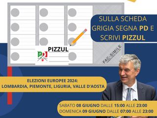 Vi ho raggiunto con questo messaggio per farvi considerare l’ipotesi di sostenermi con il voto alle Elezioni Europee di sabato e domenica per costruire assieme un’Europa capace di essere realmente il nostro Bene Comune. Potete farlo barrando il simbolo PD e scrivendo PIZZUL sulla scheda.