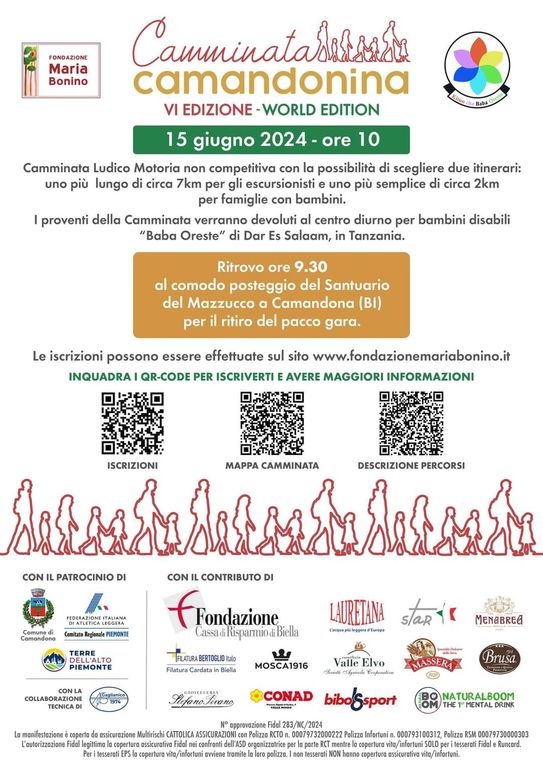 A Camandona il 15 giugno c'è la camminata Camandonina World Edition 2024, il cui ricavato sosterrà il centro diurno per bambini disabili “Baba Oreste” di Dar Es Salaam in Tanzania. La partenza è alle ore 10 dal Piazzale del Santuario del Mazzucco dove c’è un comodo parcheggio. Potrai percorrere due itinerari, uno più lungo per gli escursionisti e uno più semplice per famiglie con bambini. Se decidi di partecipare all’ultimo momento potrai iscriverti la mattina stessa alla partenza dalle ore 9. L’evento è realizzato dalla Fondazione Maria Bonino con il contributo della Fondazione CR Biella, con il patrocinio del Comune di Camandona, di Biella Turismo , con la collaborazione tecnica dell’ As Gaglianico 1974 e della Fidal Piemonte