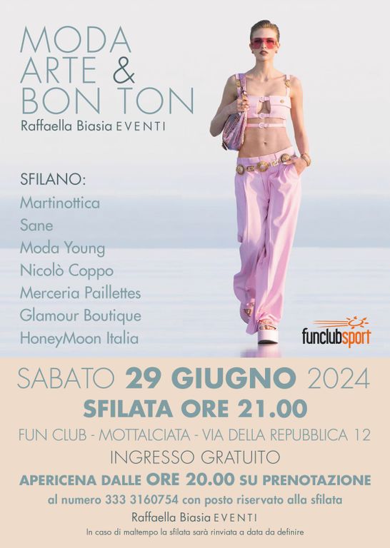 Dopo il rinvio per maltempo, c'è la data per la sfilata dal titolo Moda, Arte e Bon Ton. L'evento si terrà il prossimo 29 giugno, alle 21, al Fun Club di Mottalciata, in via della Repubblica 12. Sfilano Martinottica, Sane, Moda Young, Nicolò Coppo, Merceria Paillettes, Glamour Boutique, HoneyMoon Italia e Strenghetto Parrucchieri.