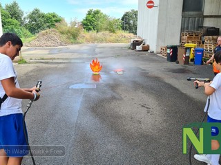 In aula una infarinatura su chi sono i volontari dell'Antincendi Boschivi e quali attività svolgono e poi tutti all'aperto a vedere i mezzi e il loro funzionamento e a provare a spegnere il "fuoco" - sagome di legno - con le lance in dotazione ai volontari.