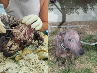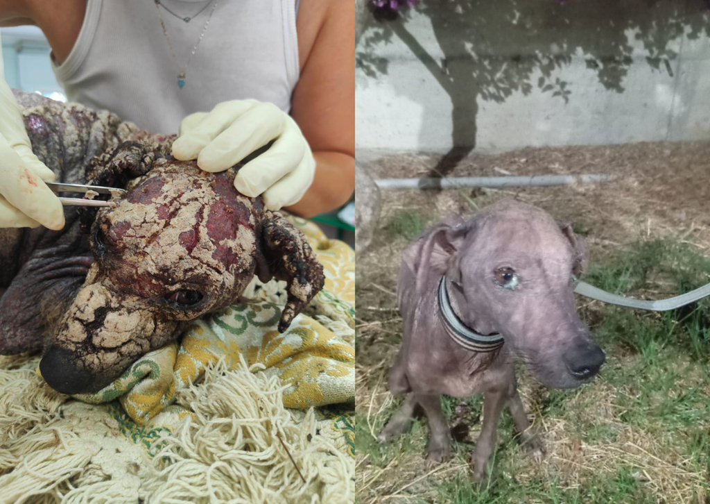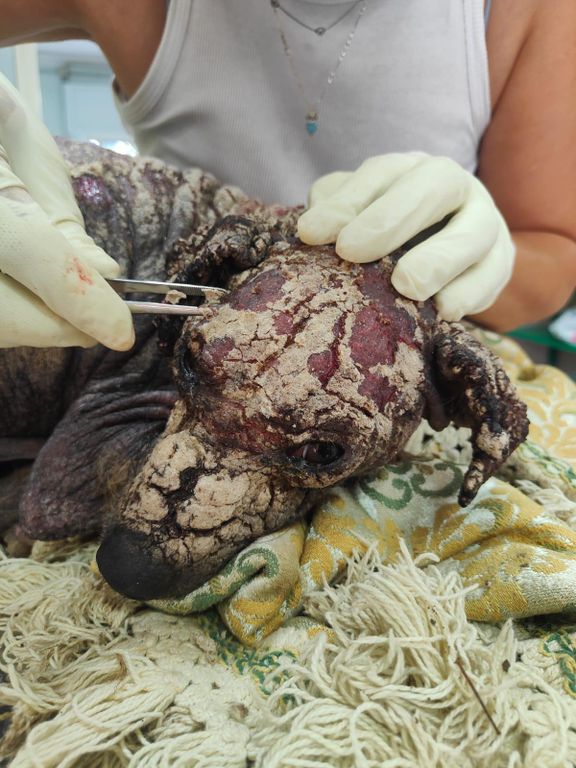 Tony ha una situazione abbastanza importante: leishmania altissima, rogna sarcoptica, anemia, albumine, ecc. La prognosi resta riservata: lui reagisce ma è ancora molto grave. Si trova ricoverato a Pegaso in una clinica veterinaria.