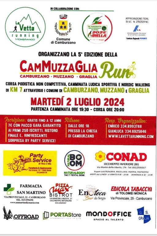 Si terrà oggi, martedì 2 luglio, la CamMuzzaGlia Run: la manifestazione sportiva non competitiva che riunisce i paesi di Camburzano, Muzzano e Graglia. Una corsa podistica non competitiva, una camminata ludico-motoria e nordic walking per coinvolgere tutti gli sportivi: dai più ai meno allenati, in un percorso di 7 km.