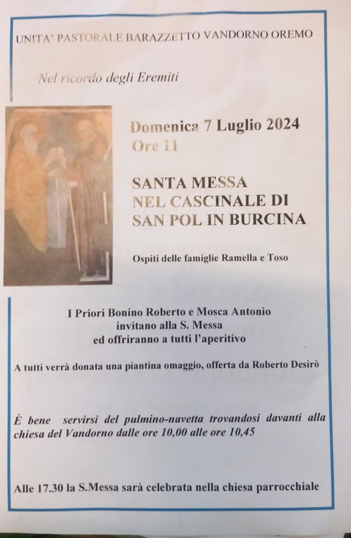Domenica 7 luglio, alle 11, avrà luogo la Santa Messa nel cascinale di San Pol in Burcina. Al termine della funzione, un aperitivo per i fedeli. Alle 17.30 la Santa Messa sarà celebrata nella chiesa parrocchiale.