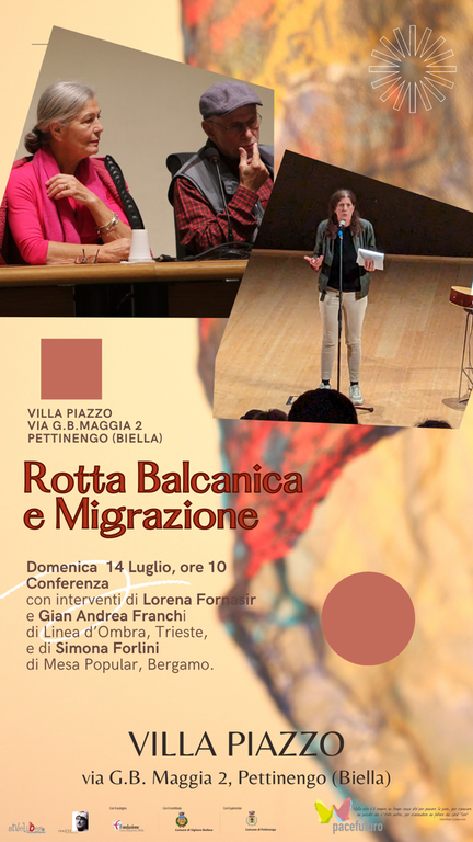 Alle 10 Villa Piazzo ospiterà la conferenza “Rotta Balcanica e Migrazione”, con interventi di Lorena Fornasir e Gian Andrea Franchi di Linea d’Ombra, Trieste, e di Simona Forlini di Mesa Popular, Bergamo.