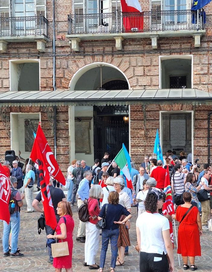 Quella di questa sera è stata sicuramente una piazza Castello gremita di persone, ma soprattutto colma di una stampa unita. Sono stati infatti molti i gruppi sindacali e le associazioni presenti, tra cui: CGIL, SPI, ANPI, UIL e l'Associazione Stampa Subalpina (promotrice e organizzatrice dell'evento).
