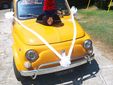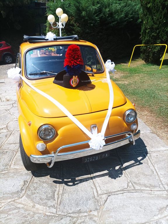 E ad accompagnare il loro viaggio nella nuova vita una 500 gialla con tantissimi fiori colorati.