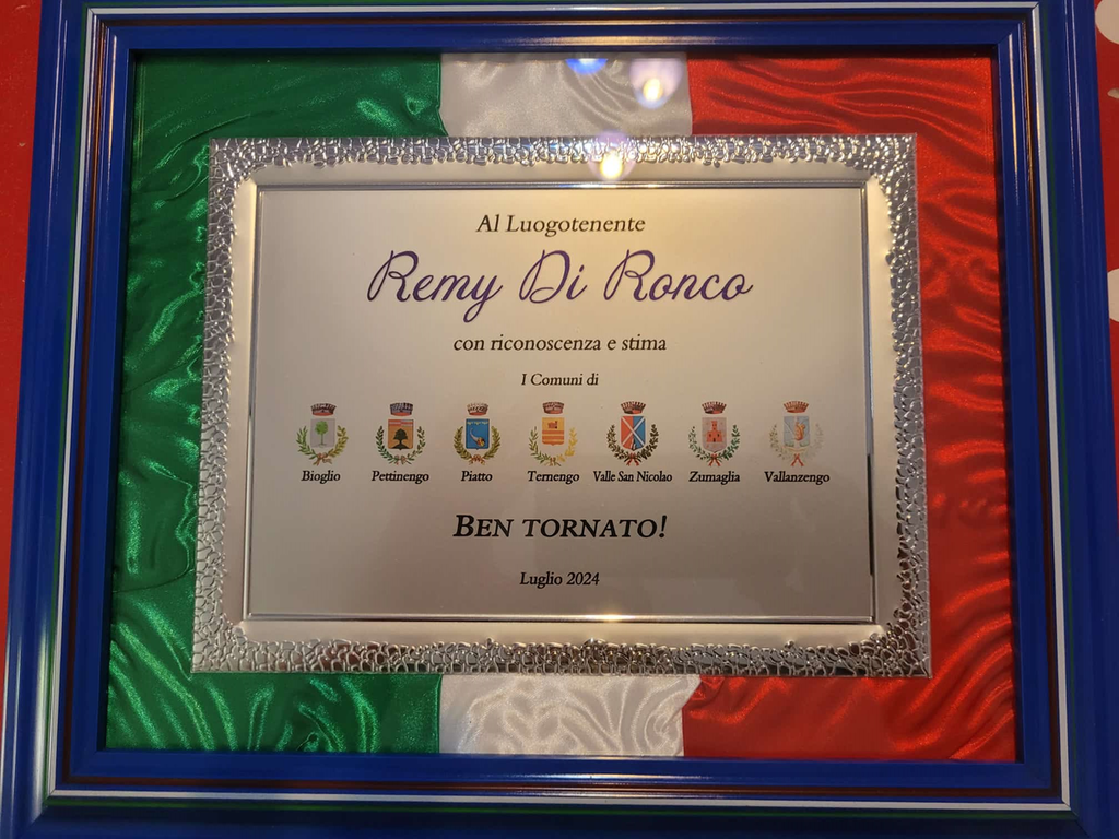 Giovedì scorso, in aula consiliare, i comuni di Bioglio, Pettinengo, Piatto, Ternengo, Valle San Nicolao, Zumaglia e Vallanzengo gli hanno consegnato una targa di profondo ringraziamento e “ben tornato”.