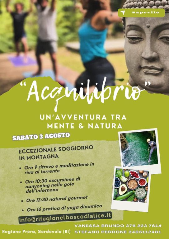 Yoga, meditazione e un'escursione di canyoning nelle gole dell'Infernone. È il ricco programma che ha in mente il Rifugio “Nel Bosco di Alice”, location immersa nel verde, situata a due passi dal torrente Elvo. Il ritrovo è previsto alle 9 di sabato 3 agosto, con l'inizio di “Acquilibrio”, l'avventura che coniuga mente e natura.