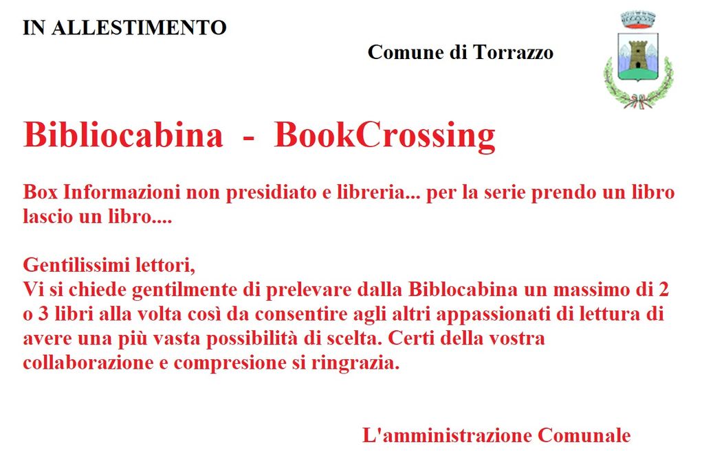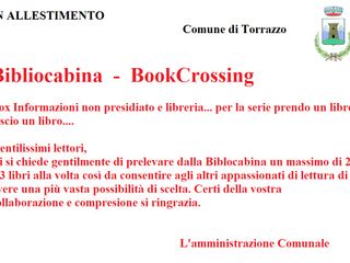 Nella mattina di sabato 3 agosto a Torrazzo è stata installata la Bibliocabina BookCrossing ed Infopoint, una vecchia cabina telefonica che funzionerà come punto scambio libri, collocata nello stesso punto dove, molti anni fa, c’era una vera cabina telefonica.