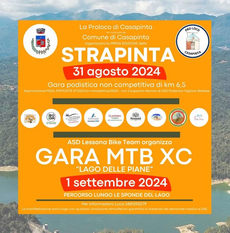 Si partirà sabato 31 agosto alle 17.30 con la prima edizione della Strapinta, camminata ludico motoria non competitiva di 6,5 km lungo gli spettacolari sentieri sterrati che costeggiano il Lago delle Piane. Un momento di sport - la gara è inserita nel circuito FIDAL Piemonte, ma anche di festa, con un pacco gara del territorio, un ristoro casapintese, premi ad estrazione oltre che per il più giovane e il più anziano.