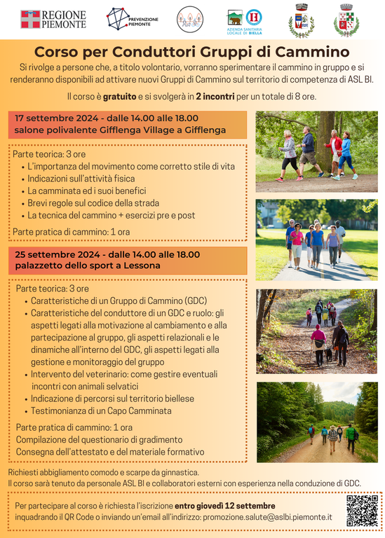 Fino al 12 settembre 2024 è possibile iscriversi al corso gratuito per diventare Conduttori di Gruppi di Cammino (GdC). Il corso è organizzato dal Dipartimento di Prevenzione dell’ASL BI, con il patrocinio dei Comuni di Gifflenga e Lessona e rientra nel Programma 2 – “Comunità attive” del Piano Locale della Prevenzione, ovvero dello strumento di programmazione, coordinamento ed attuazione a livello locale delle politiche di prevenzione, coerente con gli indirizzi e le indicazioni dei Piani Regionali della Prevenzione.