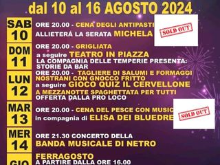 Domenica sarà dedicata alla grigliata seguita dal "Teatro in Piazza". La Compagnia delle Temperie presenterà "Storie da Bar", uno spettacolo che promette di divertire e intrattenere tutti i presenti.