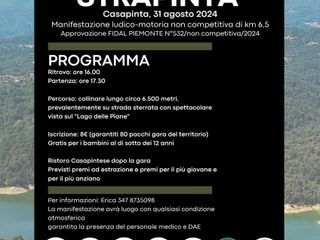 Avrà luogo con qualsiasi condizione atmosferica ed è garantita la presenza del personale medico e DAE. Il ritrovo è alle 16, a Casapinta, e si partirà alle 17:30. La quota d’iscrizione è pari a otto euro, ma è gratis per i bambini al di sotto dei 12 anni. Il percorso si trova prevalentemente su una strada sterrata con vista sul Lago delle Piane. Sarà disponibile mangiare dopo la gara e saranno previsti alcuni premi ad estrazione e altri per il più giovane e il più anziano.