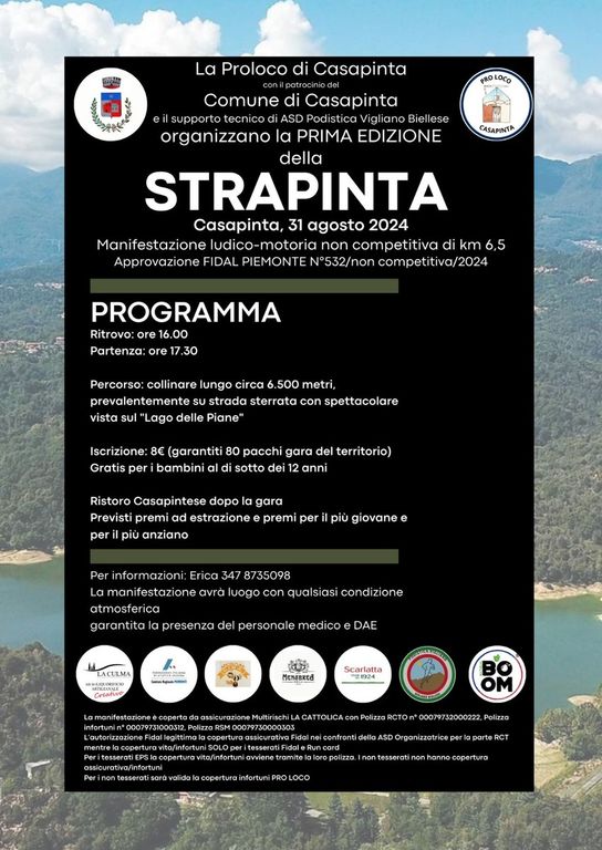 La Pro Loco di Casapinta, con il patrocinio del Comune e il supporto tecnico di ASD Podistica Vigliano Biellese, organizzano la prima edizione della Strapinta. Si tratta di una manifestazione ludico-motoria non competitiva di 6.5 km e si terrà il 31 agosto.
