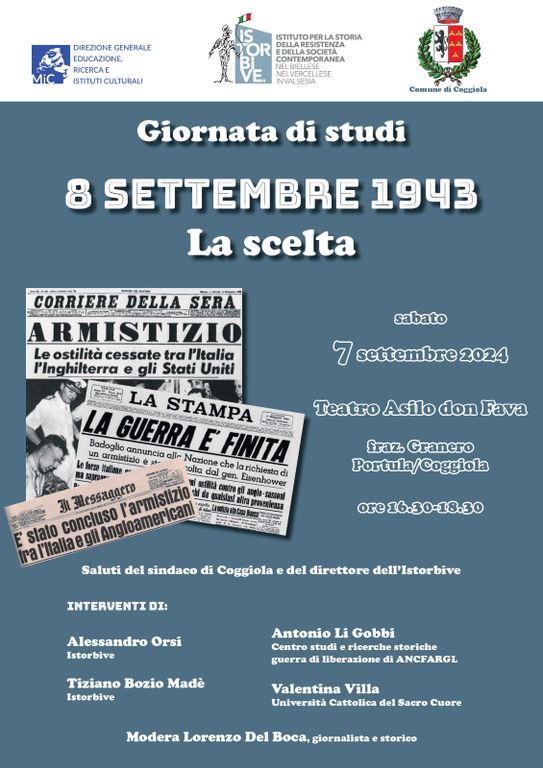 Giornata di studi a Coggiola: al centro dell'incontro, in programma sabato 7 settembre, dalle 16.30 alle 18.30, al Teatro Asilo don Fava di frazione Granero, a Coggiola, l'8 settembre 1943.
