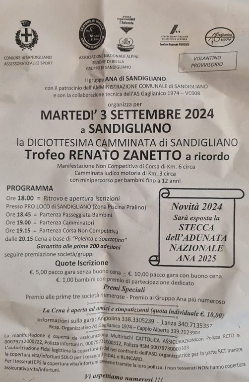 Il primo è questa sera, oggi martedì 3 settembre a Sandigliano dove si corre per la diciottesima camminata trofeo in ricordo di Renato Zanetto. Si tratta di una manifestazione non competitiva di circa 6 km, una camminata ludico motoria di 3 km e un minipercorso per i bambini fino ai 12 anni. Questo il PROGRAMMA Ore 18.00 Ritrovo e apertura iscrizioni Presso PRO LOCO di SANDIGLIANO (Zona Piscina Pralino) Ore 18.45 = Partenza Passeggiata Bambini Ore 19.00 = Partenza Camminatori Ore 19.15 = Partenza Corsa Non Competitiva dalle 20.15 Cena. A seguire premiazione società/gruppi. Informazioni sulla gara: Angiolina 338.3305239 - Lanza 340.7135357 Resp. Organizzativo AS Gaglianico 1974 – Cappio Alberto 339.7123903