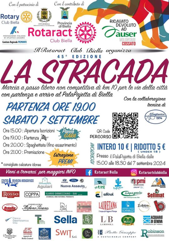 Sabato 7 settembre 2024 a Biella torna "La Stracada", storica corsa podistica non competitiva di 10 Km per le vie della Città di Biella, che quest'anno vedrà la sua 45esima edizione. Si tratta di un evento organizzato dal Rotaract Club di Biella. La corsa, organizzata con il contributo della Provincia di Biella e con il Patrocinio del Rotary Club Biella e della Città di Biella, partirà alle ore 19.00 dal Palapajetta, in via Pietro Paietta, dove sono previsti anche l' arrivo, le iscrizioni e la consegna dei pacchi gara (fino esaurimento) che avranno luogo il medesimo giorno, a partire dalle ore 15.00.