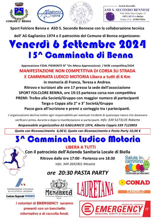 Venerdì 6 settembre a Benna ci sarà invece la I5^ Camminata di Benna, manifestazione non competitiva di corsa su strada e camminata ludico motoria Libera a tutti di 6 Km in memoria di Franco, Teresa e Andrea. Ritrovo e iscrizioni alle ore 17 presso la sede dell'associazione SPORT FOLCLORE BENNA, ore 19:15 partenza corsa non competitiva PREMI: Trofeo alla Società/Gruppo con maggior numero di partecipanti Targa o Coppa alla 2* e 3 Società/Gruppo. Per info 339 5273135 Roberto e Responsabile organizzativo AS GAGLIANICO 1974, Alberto Cappio 339 712 1903. 3^ Camminata ludico Motoria LIBERA A TUTTI Con il patrocinio dell'Azienda Sanitaria Locale di Biella Ritrovo dalle ore 17:00 - Partenza ore 18-30 Salute in cammino info 349 2692901 Micaela.