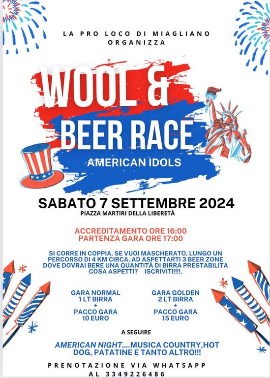 A Miagliano sabato 7 settembre torna la "Wool & Beer Race: American Idols", un evento unico nel suo genere che unisce lo sport al divertimento. Organizzata dalla Pro Loco di Miagliano, la gara prenderà il via alle 17:00 in Piazza Martiri della Libertà, con accrediti a partire dalle ore 16:00. La corsa, pensata per coppie e aperta a chiunque voglia mascherarsi a tema, si snoda lungo un percorso di circa 4 km con tre tappe obbligatorie, le "Beer Zone", dove i partecipanti dovranno fermarsi per bere una quantità prestabilita di birra. Due le opzioni di partecipazione: la "Gara Normal" con 1 litro di birra + pacco gara, e la "Gara Golden" con 2 litri di birra + pacco gara.